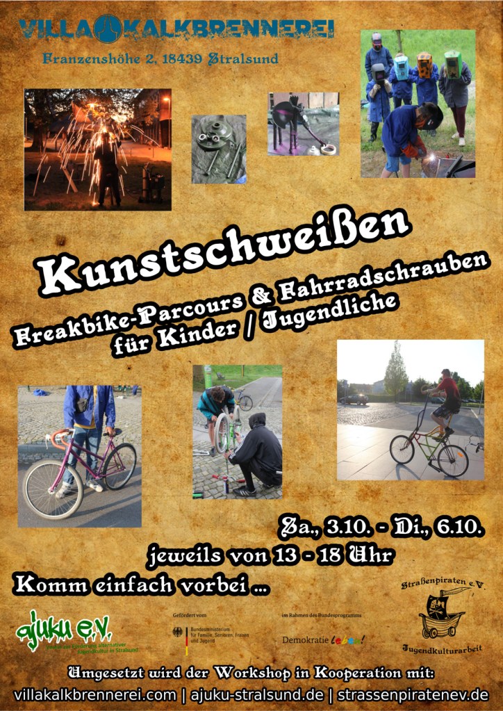 In Zusammenarbeit mit dem Straßenpiraten e.V. und der Villa Kalkbrennerei findet vom 03.10. bis 06.10.2020 ein Kunstschweißworkshop statt.